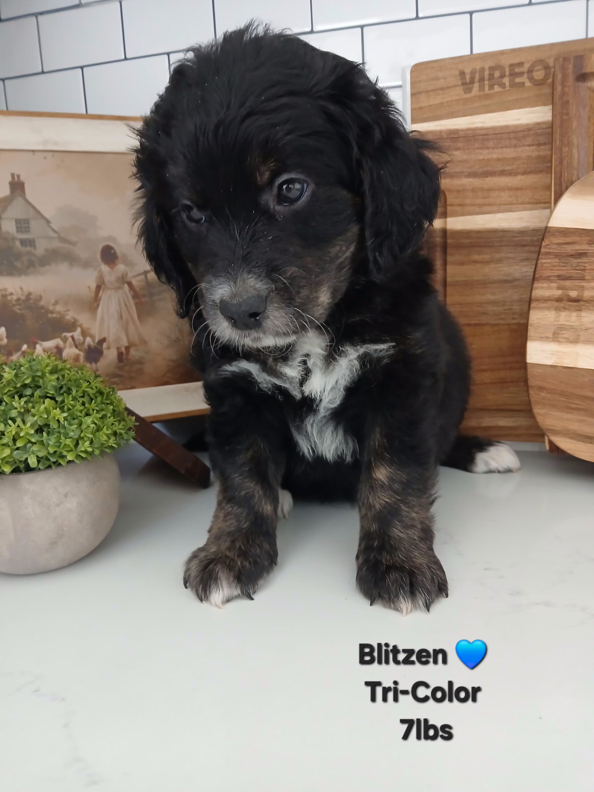 We specialize in breeding multi generation micro mini Bernedoodles and Golden Mountain Doodles. The Golden Mountain Doodle is a hypoallergenic breed of Bernese Mountain dog with a splash of the English Cream Retriever, and let's not forget the brains of the poodle. Our girls (and yes, they're sisters) range from 30-35lbs, and our sweet boy weighs 20lbs. These friendly companions are great for multiple roles in an individual or families life. Being F3Bs they will have low to no shed making them great service dogs.